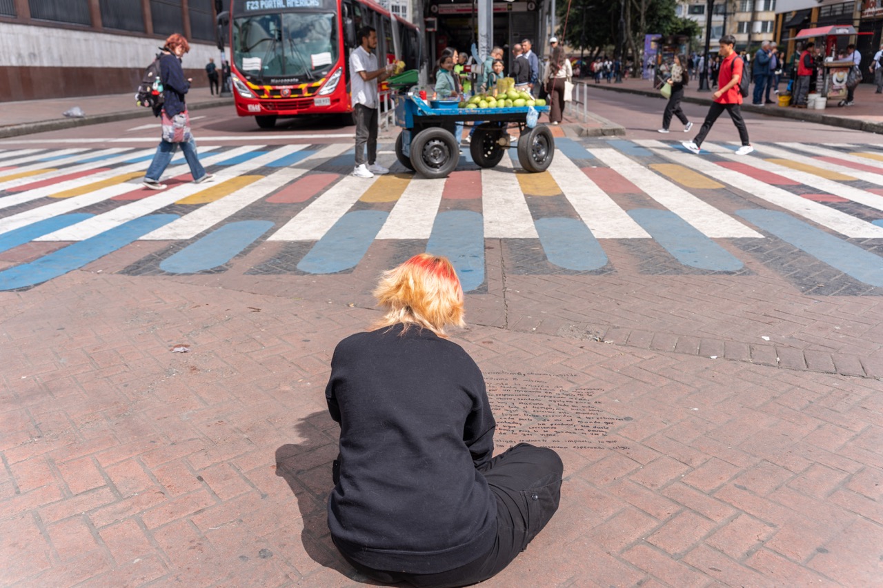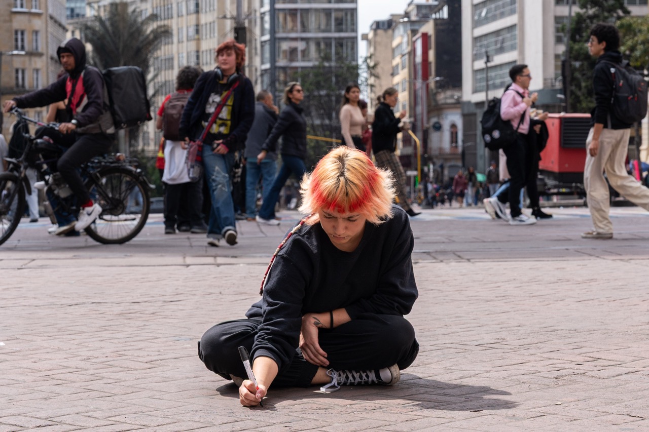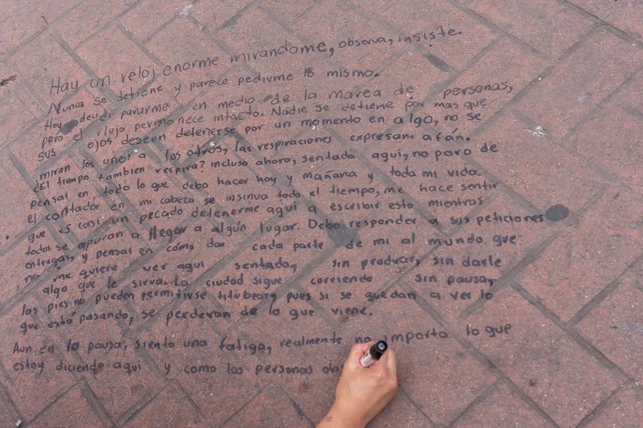 Se escribió un texto reflexivo en el suelo de un espacio público de tránsito como lo Es la carrera séptima, causando un desgaste y fragmentación de las palabras a medida que los transeúntes lo pisaban y atravesaban. En esta intervención, el pensamiento se construye y se borra simultáneamente, generando una experiencia mental efímera y cotidiana.